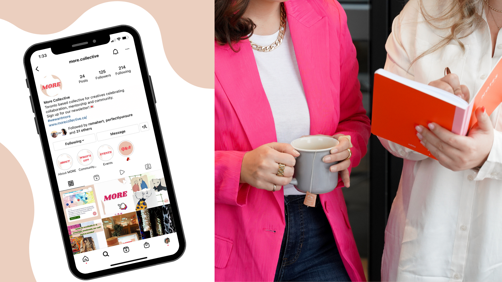 MORE Collective is a free online networking platform and a space to share in creative services, mentorship, curated events + community. Its mission is to celebrate small-scale growth, inspire + uplift, ask questions, and dispel the notion that perceived “success” defines creative capacity. Since launching, MORE has hosted two in-person events and the Much MORE Moody Blog. Created by friends Camille Borody and Angela Casullo, the small Toronto-based collective aims for creative collaboration over competition.
